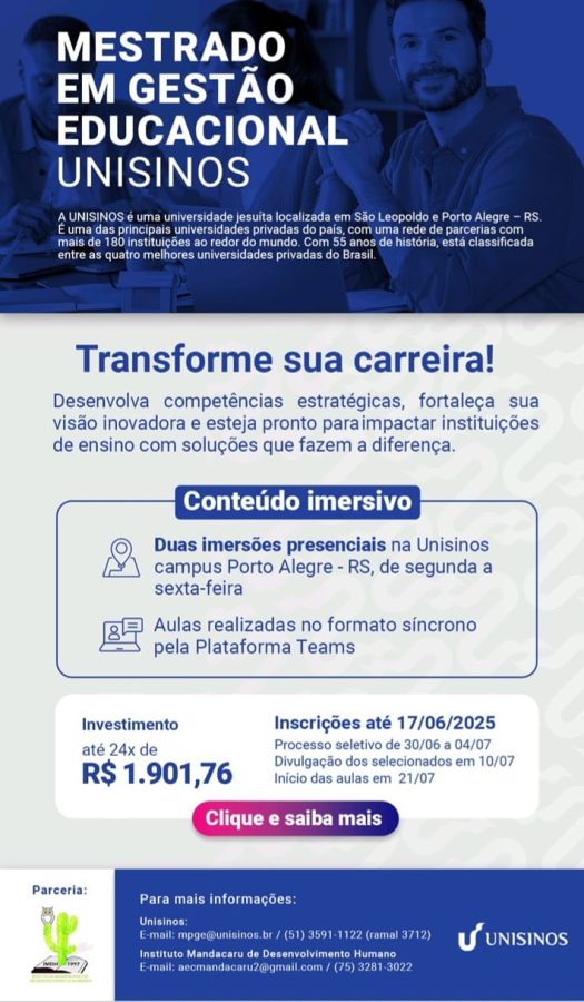 🎓 Inscrições abertas para o Mestrado em Gestão Educacional da Unisinos