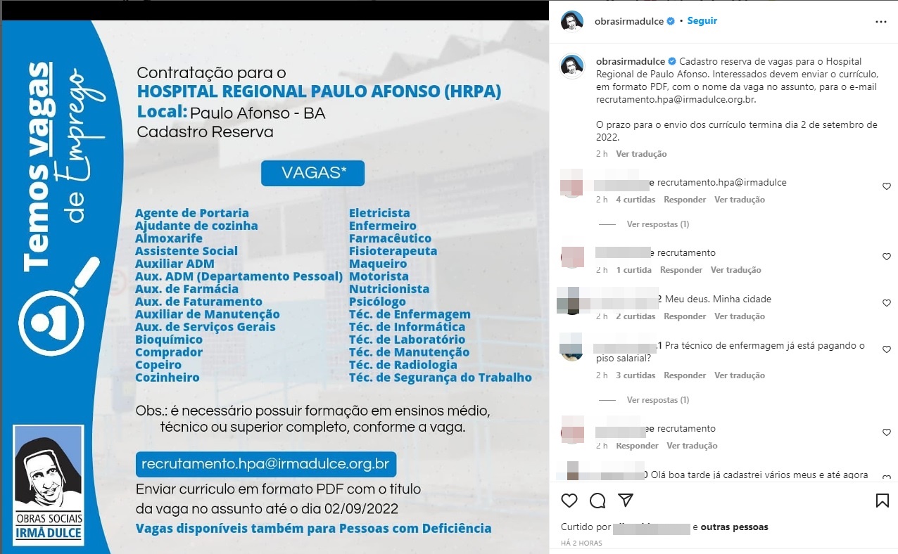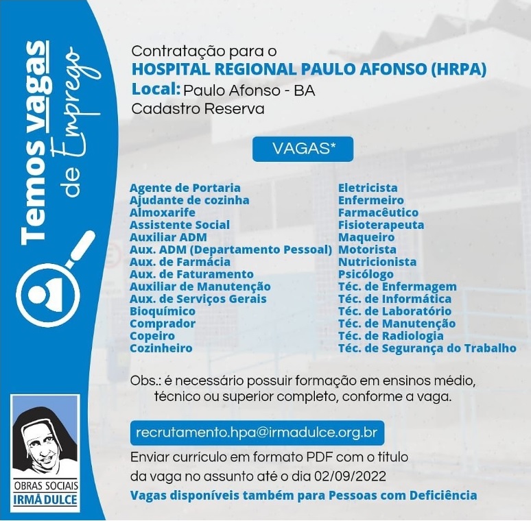 Cadastro reserva de vagas para o Hospital Regional de Paulo Afonso. Interessados devem enviar o currículo, em formato PDF, com o nome da vaga no assunto, para o e-mail recrutamento.hpa@irmadulce.org.br. O prazo para o envio dos currículo termina dia 2 de setembro de 2022. (Repost @obrasirmadulce)