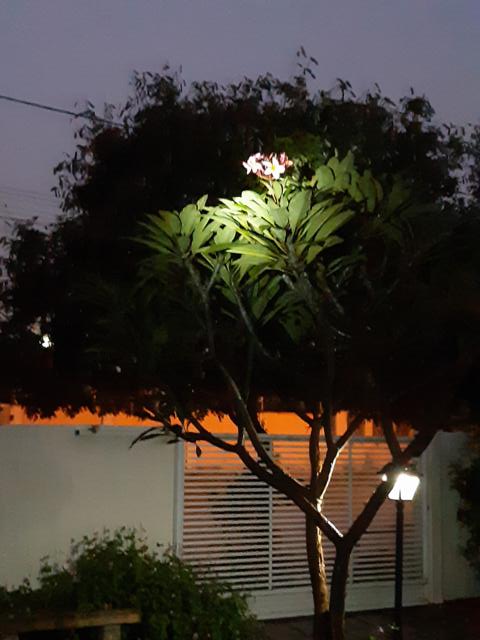 Entrementes, verifique o leitor a foto que vai com a matéria: com sete dias quase completos da companhia de Otta nas suas raízes, a primeira resposta poderosa, convincente, irrefutável, sublime e bela da nova companheira. Lá bem no alto, aberta na sua intimidade para o além, o primeiro buquê da nova florada da mesma companheira.