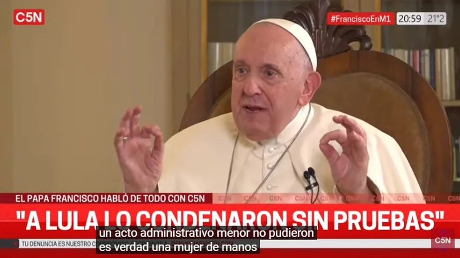 Em entrevista à TV argentina C5N, o papa Francisco voltou a afirmar nesta sexta-feira que o presidente Luiz Inácio Lula da Silva (PT) foi condenado sem provas. O pontífice disse ainda que foi injusto o impeachment da ex-presidente Dilma Rousseff, em 2016, e que ela é “mãos limpas” e uma “excelente mulher”. Ao ser questionado sobre o chamado lawfare — conceito que significa uso abusivo da Justiça para fins políticos, que é usado pelo PT para criticar a atuação da força-tarefa da Lava-Jato — na América Latina, o papa lembra a condenação do petista.