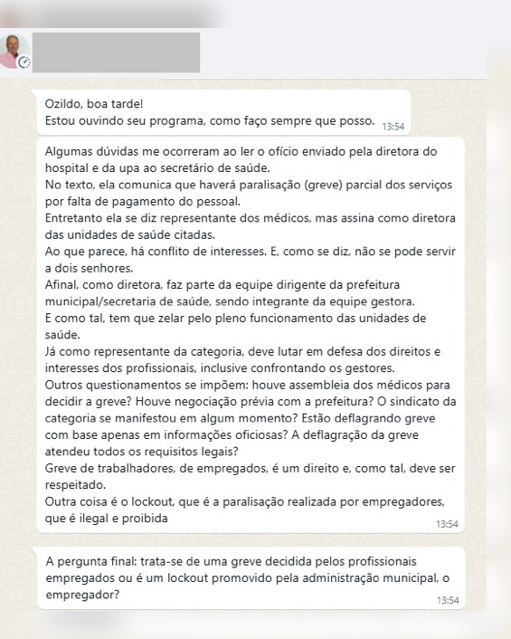 Conflito de interesses?! Ele ressaltou que, como diretora das unidades, Dra. Damyris faz parte da equipe dirigente da prefeitura e, portanto, tem o dever de assegurar o funcionamento adequado dos serviços de saúde. Por outro lado, ao afirmar representar os médicos, ela assume o papel de defender os interesses da categoria, o que pode significar pressionar a gestão por melhores condições, inclusive mediante a suspensão de atividades. “Como se diz, não se pode servir a dois senhores”, observou o ex-prefeito.