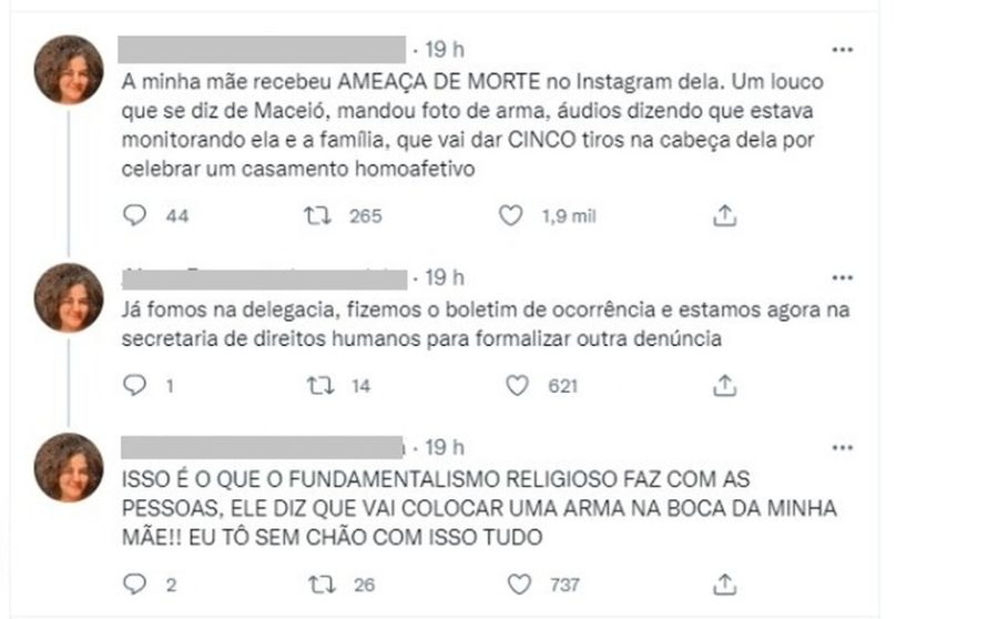 “A minha mãe recebeu ameaça de morte no Instagram dela. Um louco que se diz de Maceió, mandou foto de arma, áudios dizendo que estava monitorando ela e a família, que vai dar cinco tiros na cabeça dela por celebrar um casamento homoafetivo”, afirma a filha da pastora.