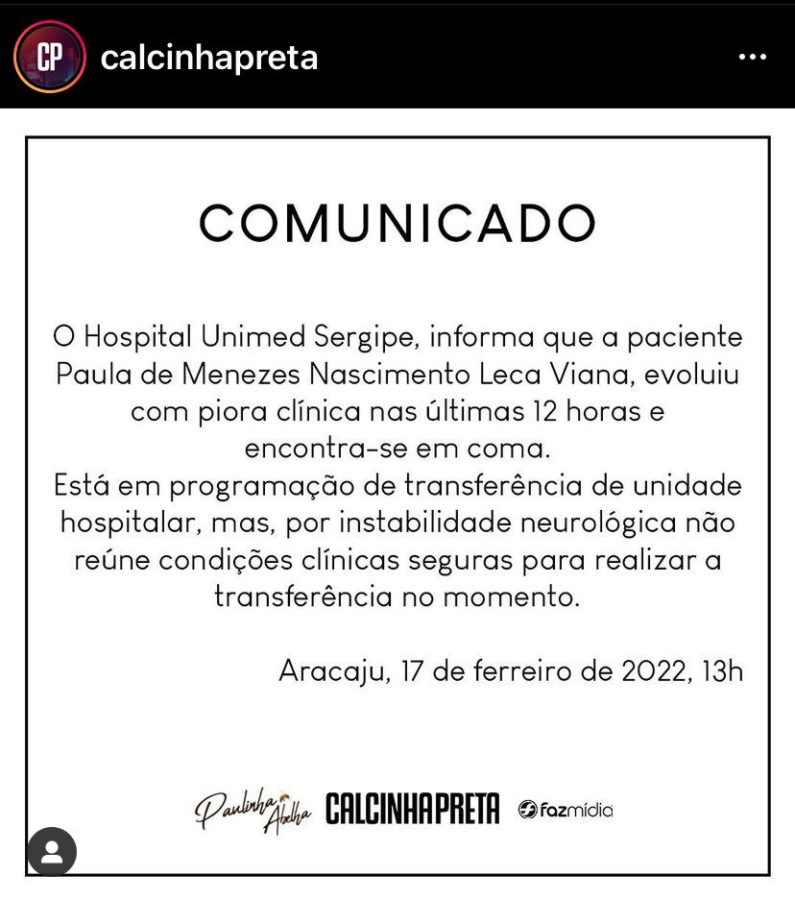 Paulinha Abelha, de 43 anos, foi hospitalizada em 11 de fevereiro em Aracaju depois de chegar de uma turnê com a banda Calcinha Preta em São Paulo, para tratar de problemas renais cuja causa não foi divulgada. No dia 14, o quadro da cantora se agravou e ela foi transferida para a UTI, além de passar a fazer diálise. Na quinta (17), novo boletim médico foi divulgado, informando que a cantora está em coma. Segundo esse boletim, estava programada a transferência da cantora para outro hospital, mas o quadro clínico de Paulinha não era estável o suficiente para que o procedimento fosse feito.