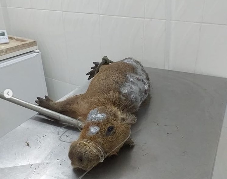 Após o resgate o animal foi levado à Clínica Veterinária Petvida, onde foi examinado. Constatou -se que na região dorsal, dorso/lateral e lateral direita da cabeça havia lesões circulares, profundas e laceradas sugestivas de ataques de predadores como, jacaré e ou piranhas.