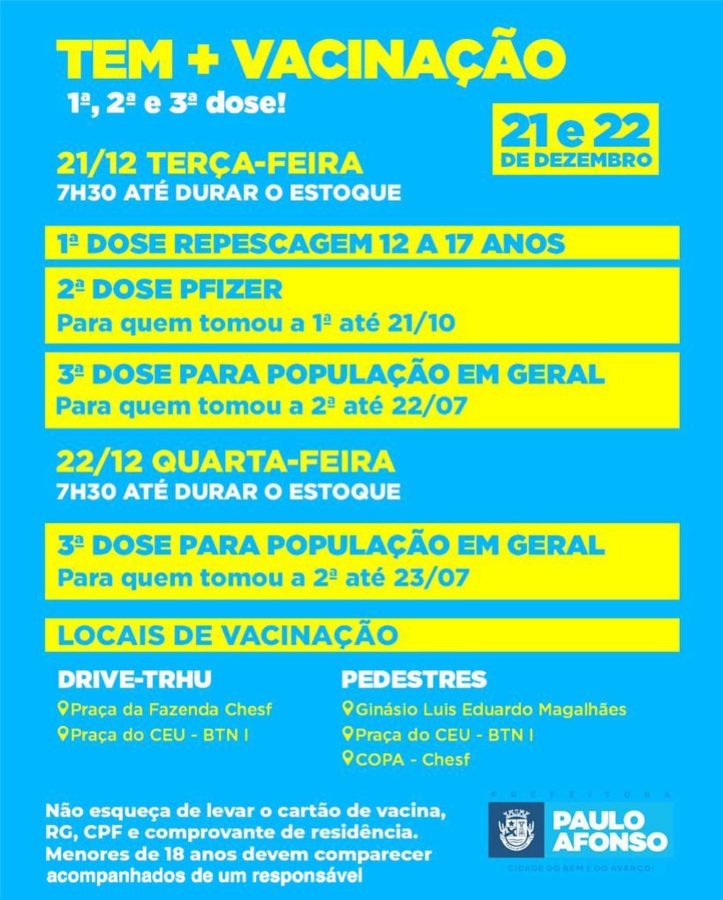 A Secretaria de Saúde realiza mais uma etapa de vacinação contra a Covid-19 com a aplicação da 1ª, 2ª e 3ª dose. A programação tem início nesta terça-feira (21) com a repescagem de 1ª dose para adolescentes de 12 a 17 anos, 2ª dose para as pessoas que tomaram 1ª dose da Pfizer até 21 de outubro e 3ª dose para a população em geral para quem tomou a 2ª até 22 de julho.