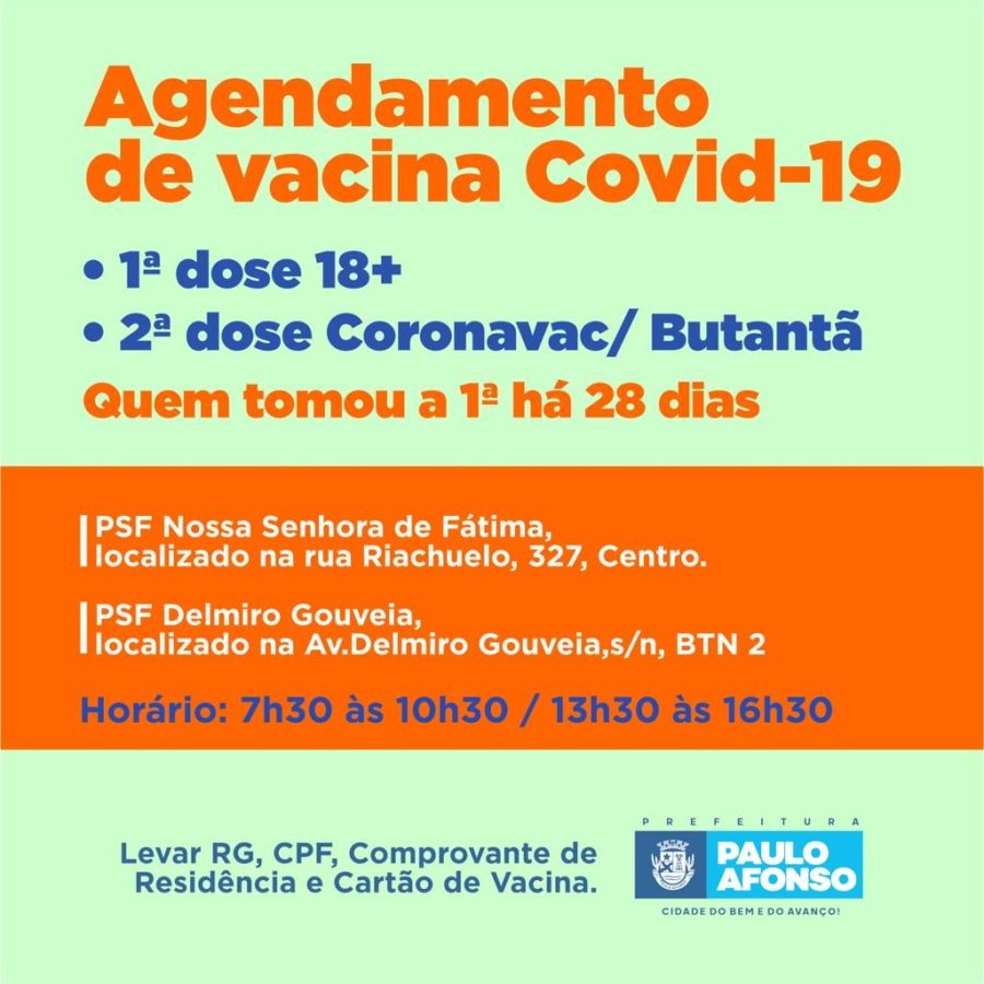 O horário de atendimento será das 7h30 às 10h30 e das 13h30 às 16h30 e os interessados devem levar RG, CPF, comprovante de residência e quem vai para a 2ª dose, também levar o cartão de vacina.