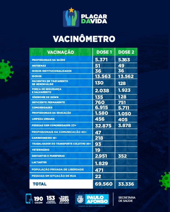 A prefeitura também informou a quantidade de pauloafonsinos que completaram a imunização – ou seja, que já receberam também a segunda dose ou dose única. Foram 33.336 imunizados completamente, ou seja, 38,6% da população vacinável.