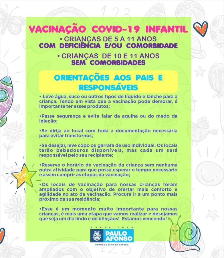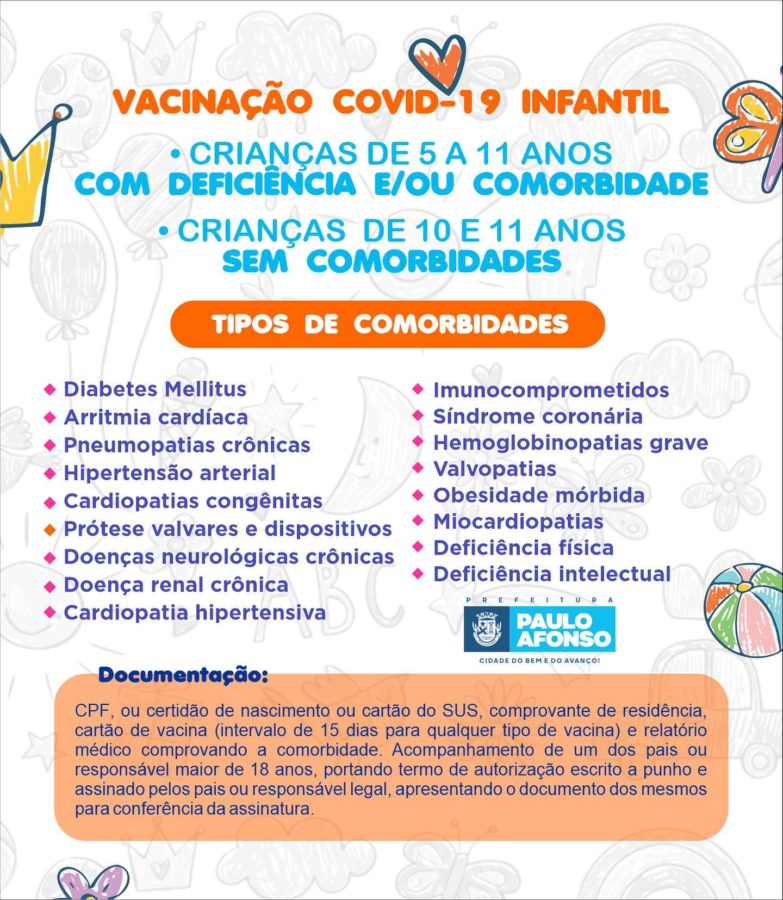 Para se vacinar é necessário levar o CPF, ou certidão de nascimento ou cartão do SUS, comprovante de residência, cartão de vacina (intervalo de 15 dias para qualquer tipo de vacina) e relatório médico comprovando a comorbidade. Acompanhamento de um dos pais ou responsável maior de 18 anos, portando termo de autorização escrito a punho e assinado pelos pais ou responsável legal, apresentando o documento dos mesmos para conferência da assinatura.