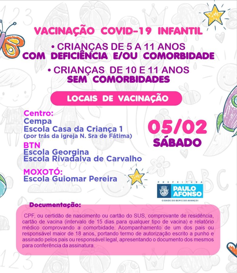 este sábado (5), tem mais uma etapa da vacinação infantil. Desta vez para crianças de 5 a 11 anos com comorbidades e/ou deficiência e de 10 e 11 anos sem comorbidades.