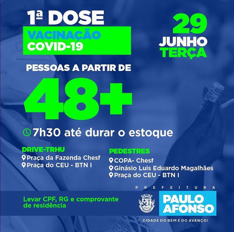 Nesta terça-feira (29), a Secretaria de Saúde realiza mais uma etapa de vacinação de 1ª dose para pessoas a partir de 48 anos. Além da redução da faixa etária, a novidade desta etapa é a inclusão do Clube operário Paulo Afonso (COPA) como mais um ponto para pedestres. A imunização terá início às 7h30 até durar o estoque.