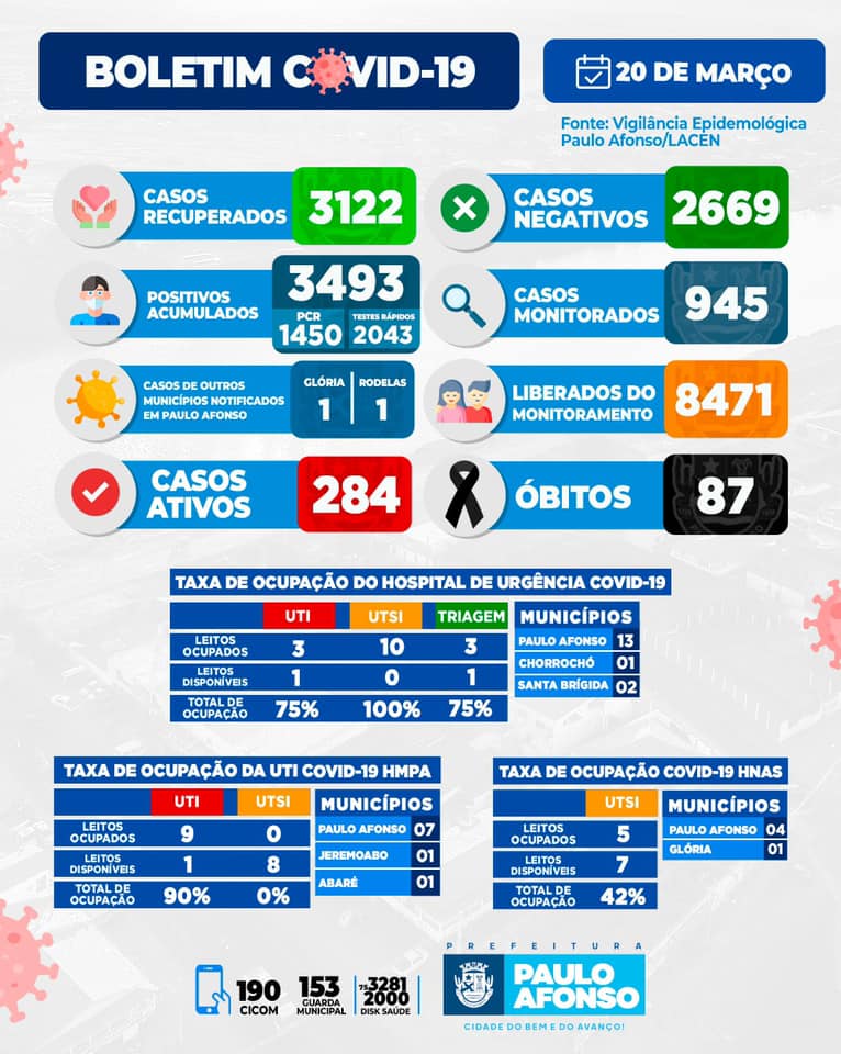Paulo Afonso atingiu, neste sábado (20), a taxa de 100% de ocupação dos leitos de Unidades de Terapia Intensiva para pacientes de Covid-19. De acordo com nota publicada pela prefeitura, todos os leitos para tratamento intensivo estão ocupados.