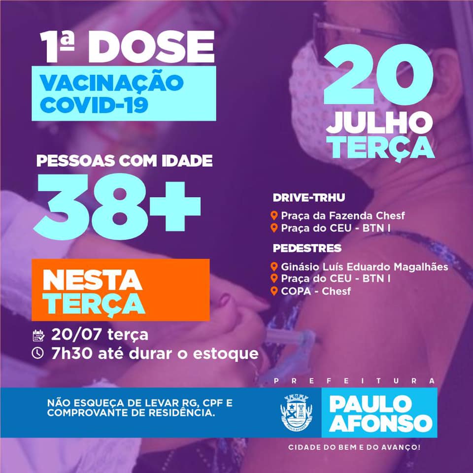Na próxima terça-feira (20), o município de Paulo Afonso inicia a imunização da 1ª dose da vacina contra a covid para o público com idade igual ou acima de 38 anos.