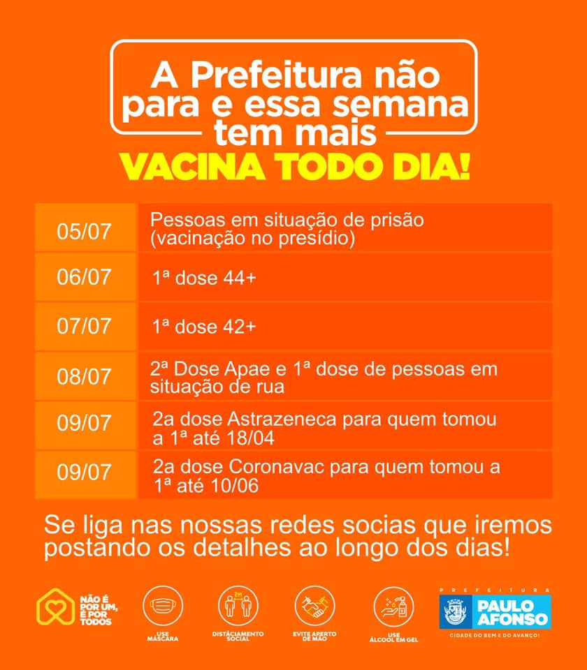 A vacinação acontece às 7h30, até durar o estoque e contará com o drive thru na Praça da Fazenda Chesf e Praça CEU, no BTN I, e para quem deseja ir a pé, no Ginásio Luís Eduardo, COPA e Praça CEU, no BTN I.