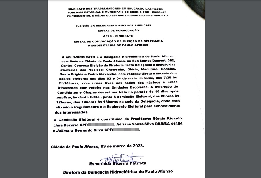 Paulo Afonso – Edital de Convocação das Eleições da APLB Sindicato