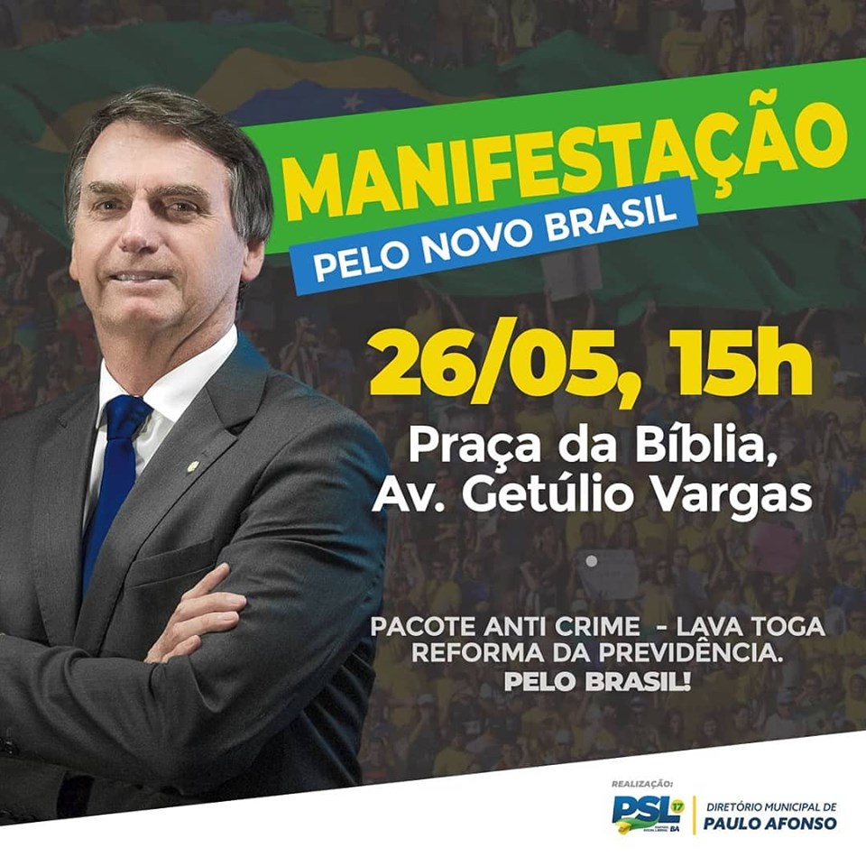 Em Paulo Afonso, o presidente municipal do PSL, Roosevelt Carvalho, publicou nas redes sociais uma arte com o convite para a manifestação de domingo. O evento local está marcado para acontecer na Praça da Bíblia, centro da cidade, a partir das 15h. “Estamos com o Brasil. Estamos com você presidente Jair Bolsonaro! em Paulo Afonso – BA!.”, escreveu o apoiador do presidente.
