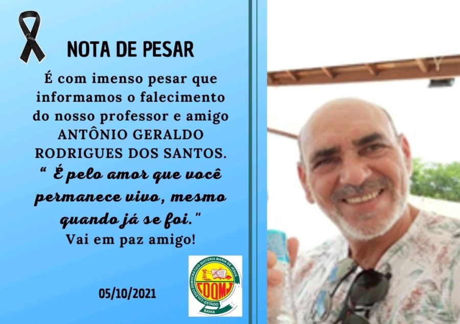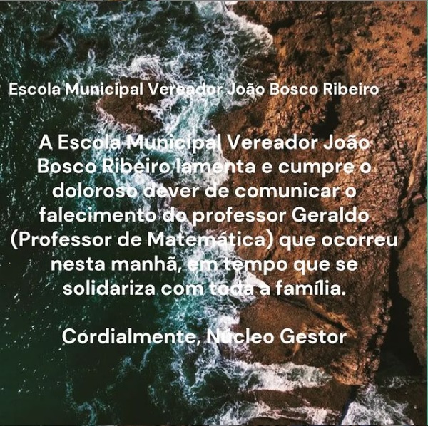 “A Escola Municipal Vereador João Bosco Ribeiro lamenta e cumpre o doloroso dever de comunicar o falecimento do professor Geraldo (de Matemática) que ocorreu nesta manhã, em tempo em que se solidariza com a família”, Cordialmente, Núcleo Escolar.
