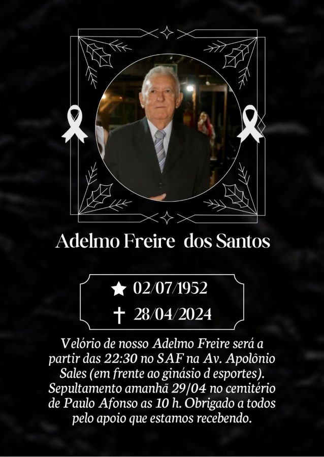 Neste momento de dor e saudade, estendemos nossas condolências e solidariedade à família e amigos de Adelmo Freire dos Santos. Que encontrem conforto e paz nos bons momentos compartilhados ao longo de sua vida.