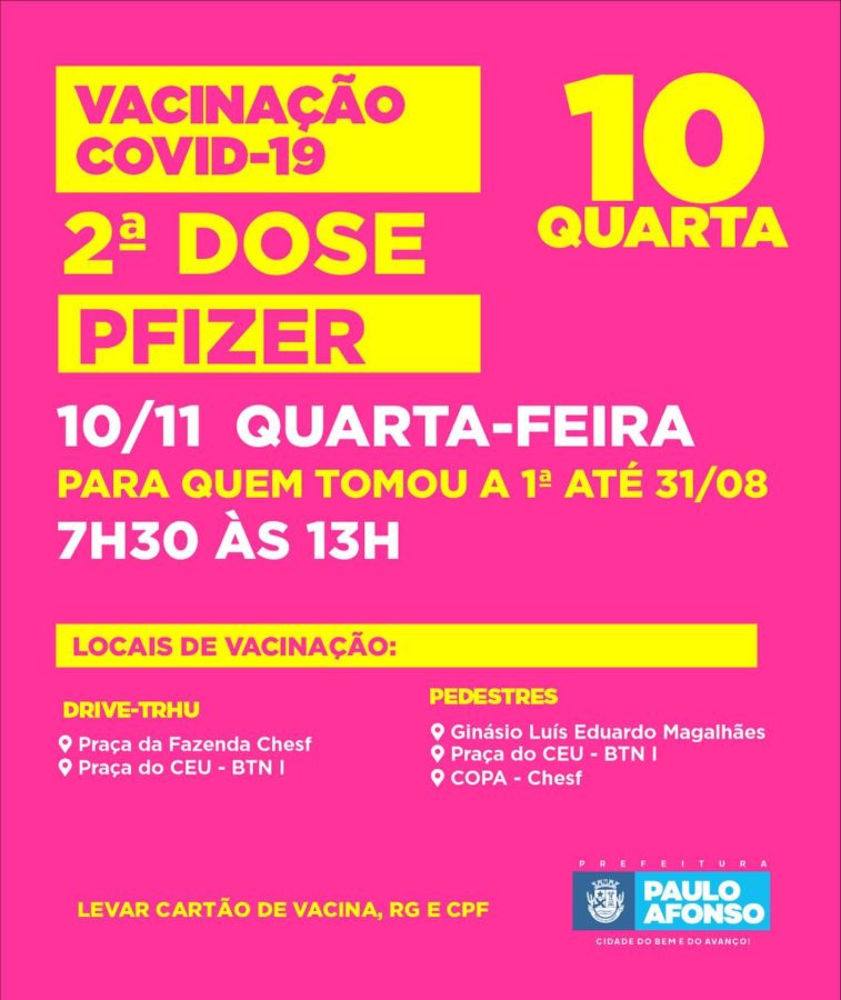 Já quarta-feira (10), é a 2ª dose da Pfizer para quem tomou a 1ª até 31 de agosto!