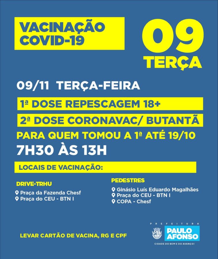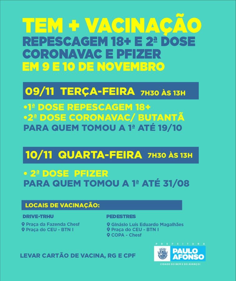 Nesta terça-feira (9), haverá repescagem com a aplicação da 1ª dose para as pessoas com 18 anos ou mais que ainda não conseguiram se vacinar. Também continua a vacinação com a 2ª dose da Coronavac. Na quarta-feira, 10 de novembro tem 2ª dose da Pfizer.