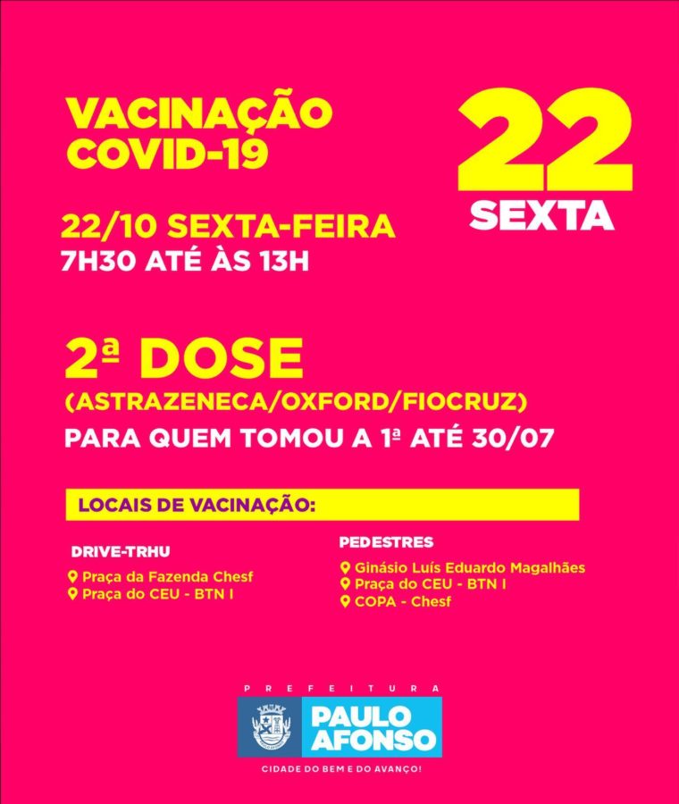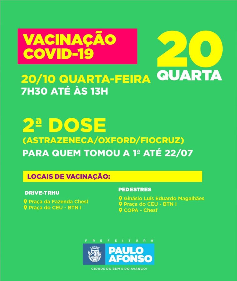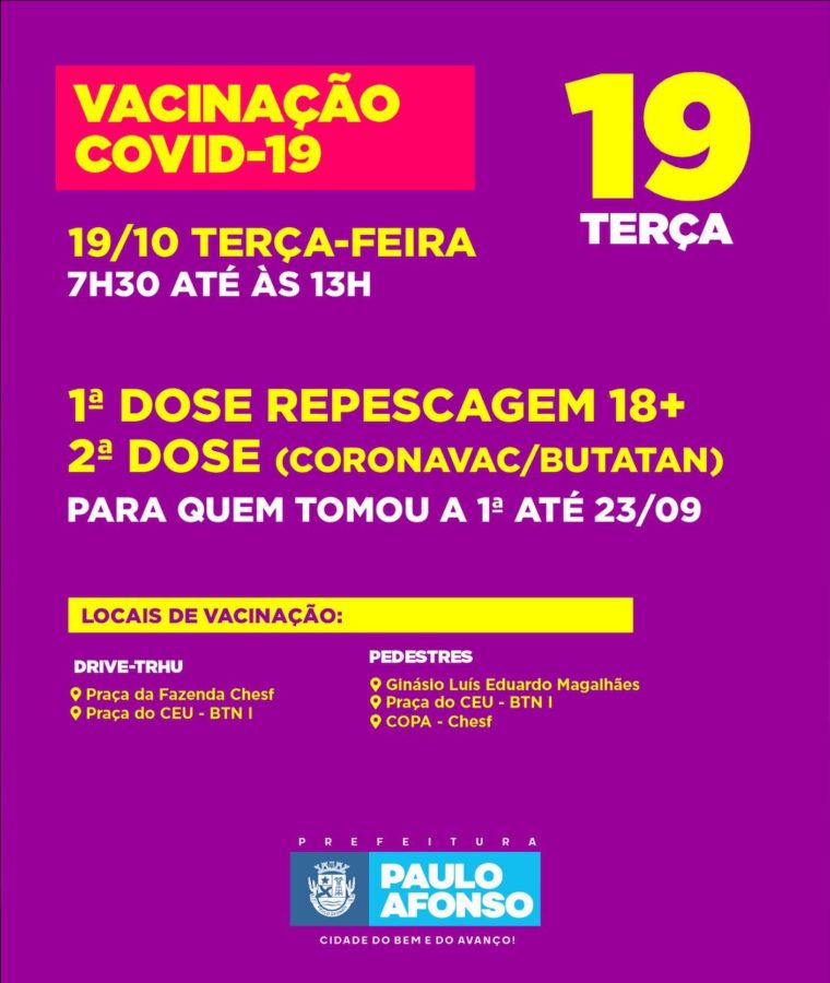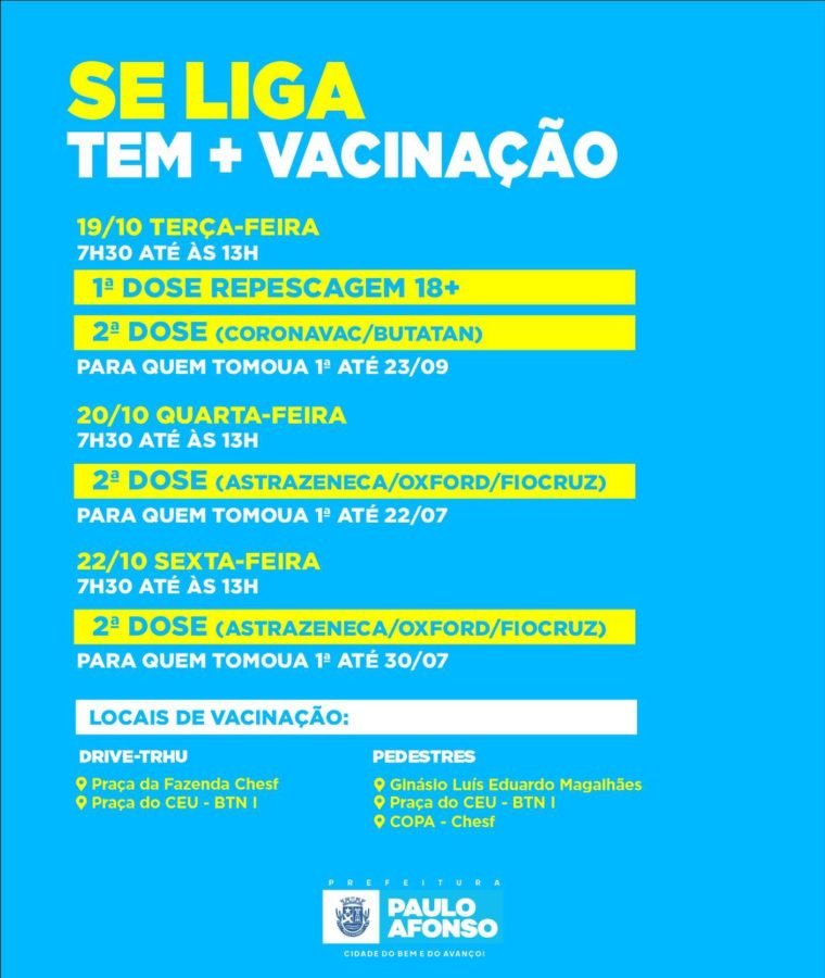 Nesta semana, a Prefeitura de Paulo Afonso realiza mais uma repescagem de aplicação de 1ª dose contra a covid-19 para as pessoas com 18 anos ou mais. Também ocorrerá a aplicação da 2ª dose dos imunizantes da Oxford e CoronaVac.