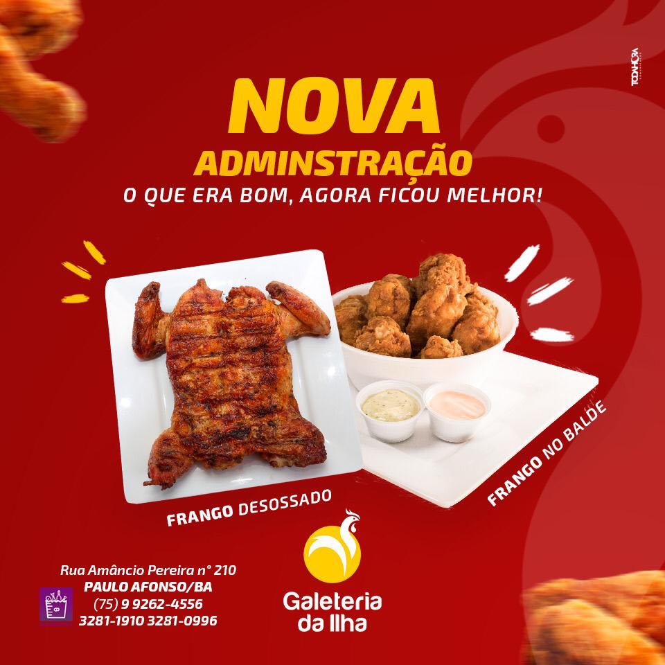 Sob nova direção, a Galeteria da Ilha, continua oferecendo aos seus clientes o melhor frango assado de Paulo Afonso, com os melhores acompanhamentos.