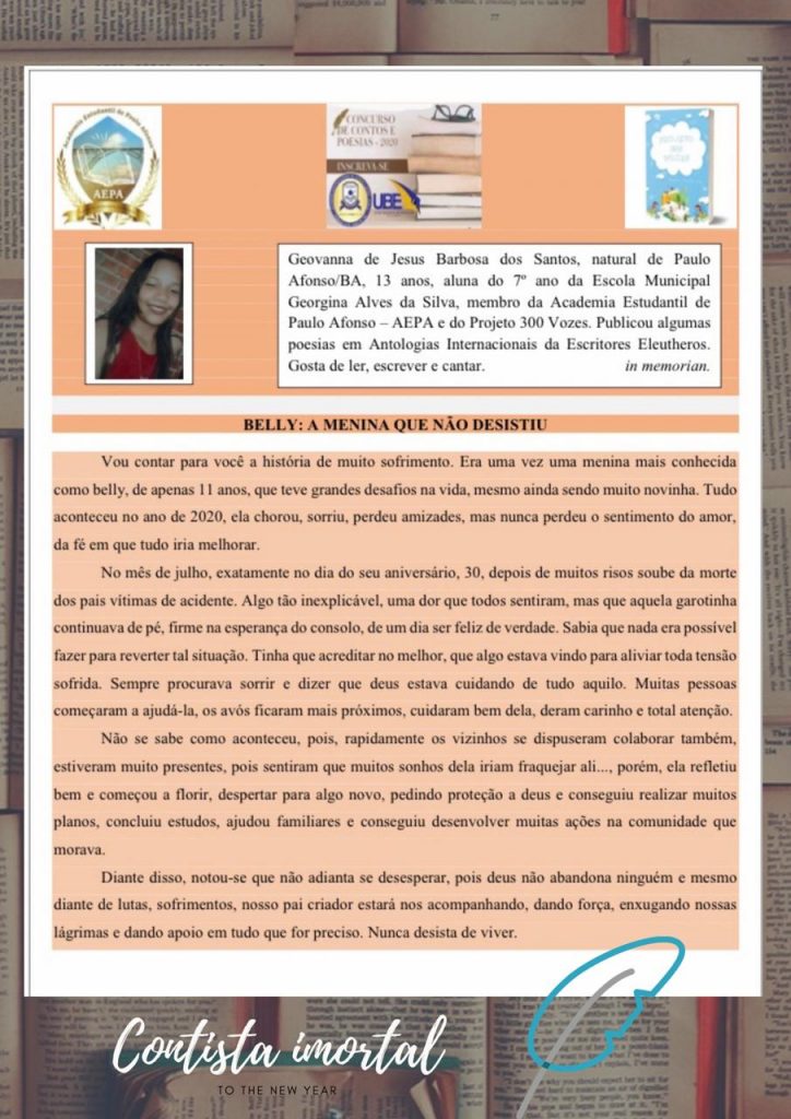 Muito estudiosa e apaixonada por literatura, a jovem escritora recentemente havia conquistado o 11º lugar num concorridíssimo Concurso de Contos e Poesias, na modalidade conto.