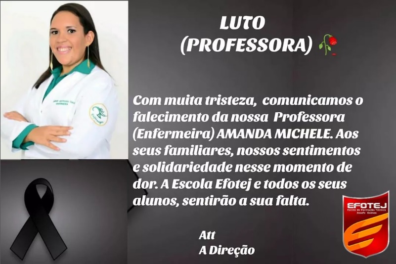 “Com muita tristeza, comunicamos o falecimento da nossa professora (enfermeira) Amanda Michele. Aos seus familiares, nossos sentimentos e solidariedade nesse momento de dor. A Escola Efotej e todos os seus alunos sentirão sua falta”, é a mensagem postada nas redes sociais do grupo.