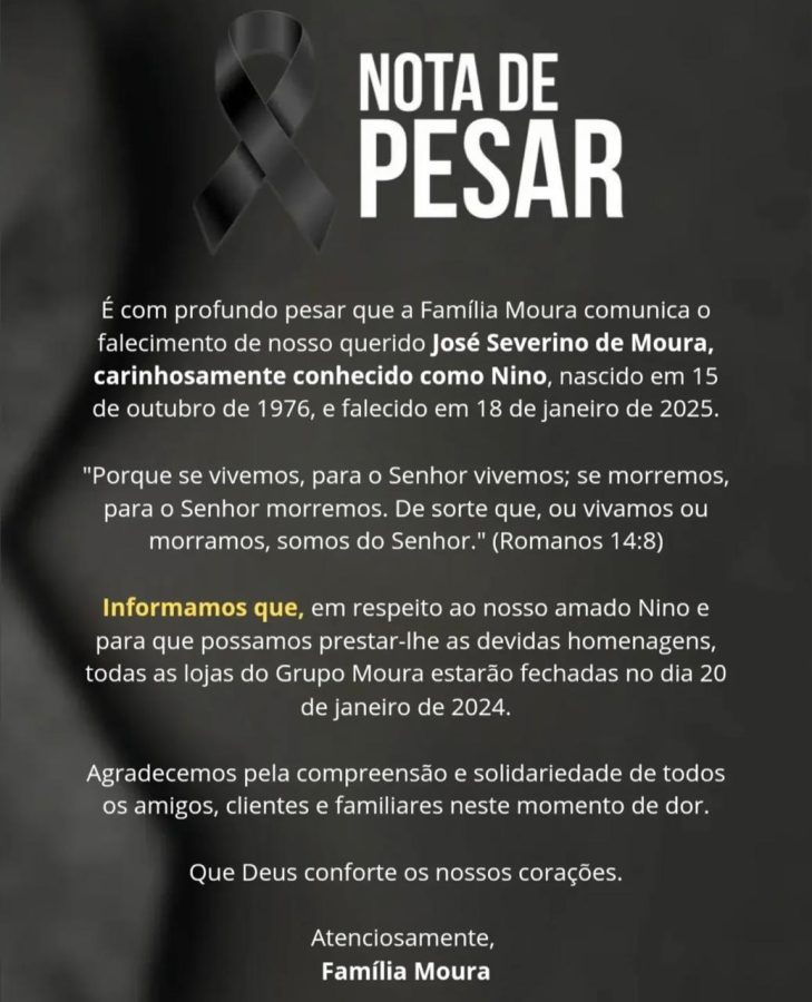 Por respeito e para homenagear Nino, o Grupo Moura anunciou que todas as lojas estarão fechadas no dia 20 de janeiro de 2025. A empresa agradeceu a solidariedade e compreensão de amigos, familiares e clientes neste momento de dor, pedindo que Deus conforte os corações de todos.