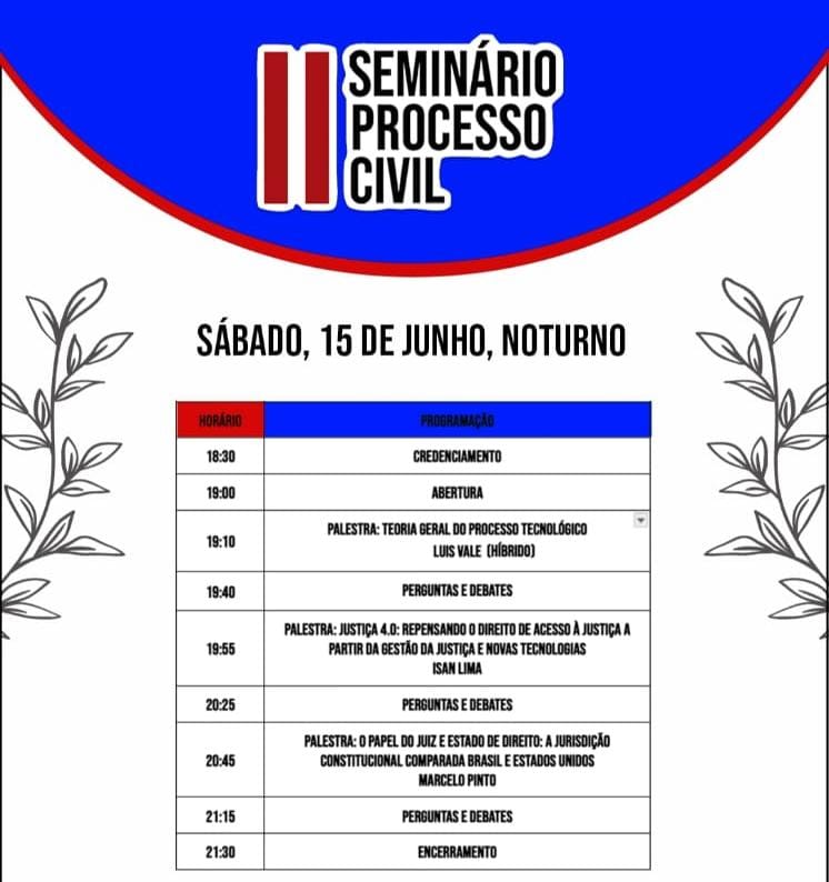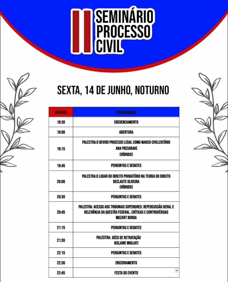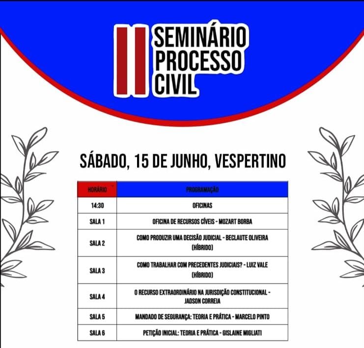 Prepare-se para dois dias intensos de aprendizado, com palestras que abordarão as mais recentes atualizações e debates no campo do Processo Civil. Além disso, teremos minicursos exclusivos que permitirão um mergulho ainda mais profundo nas temáticas de maior relevância para os estudiosos e futuros profissionais da área.