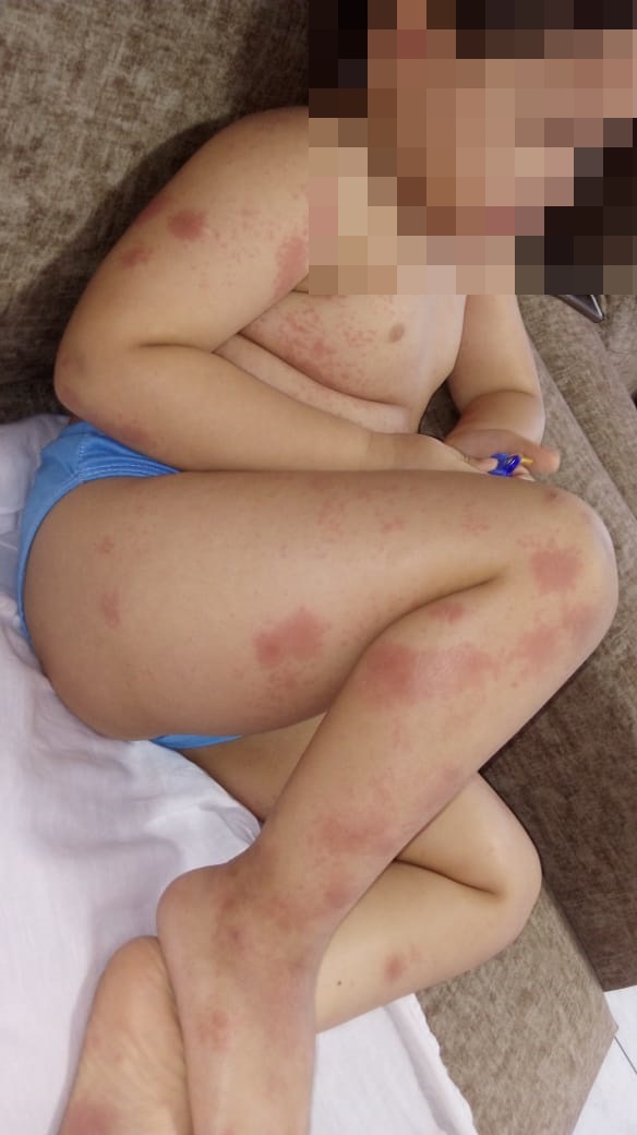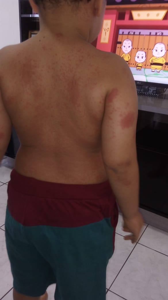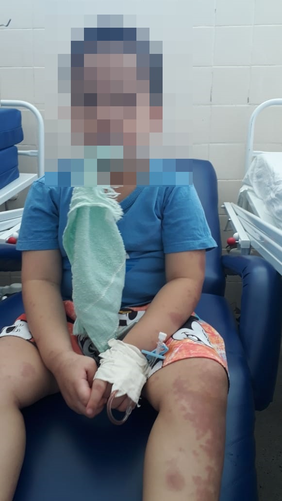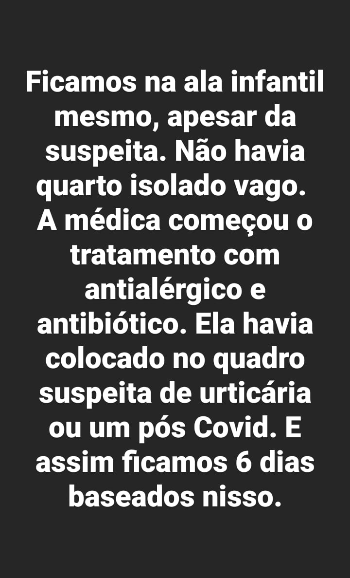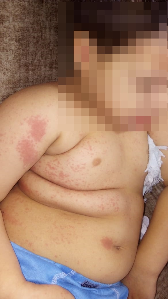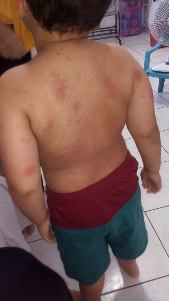 A mãe também enviou imagens do filho com os sintomas na pele ou edemas espalhados por todo o corpo, uma cópia do resultado do exame sorológico constatando ser covid e cópia do prontuário médico: