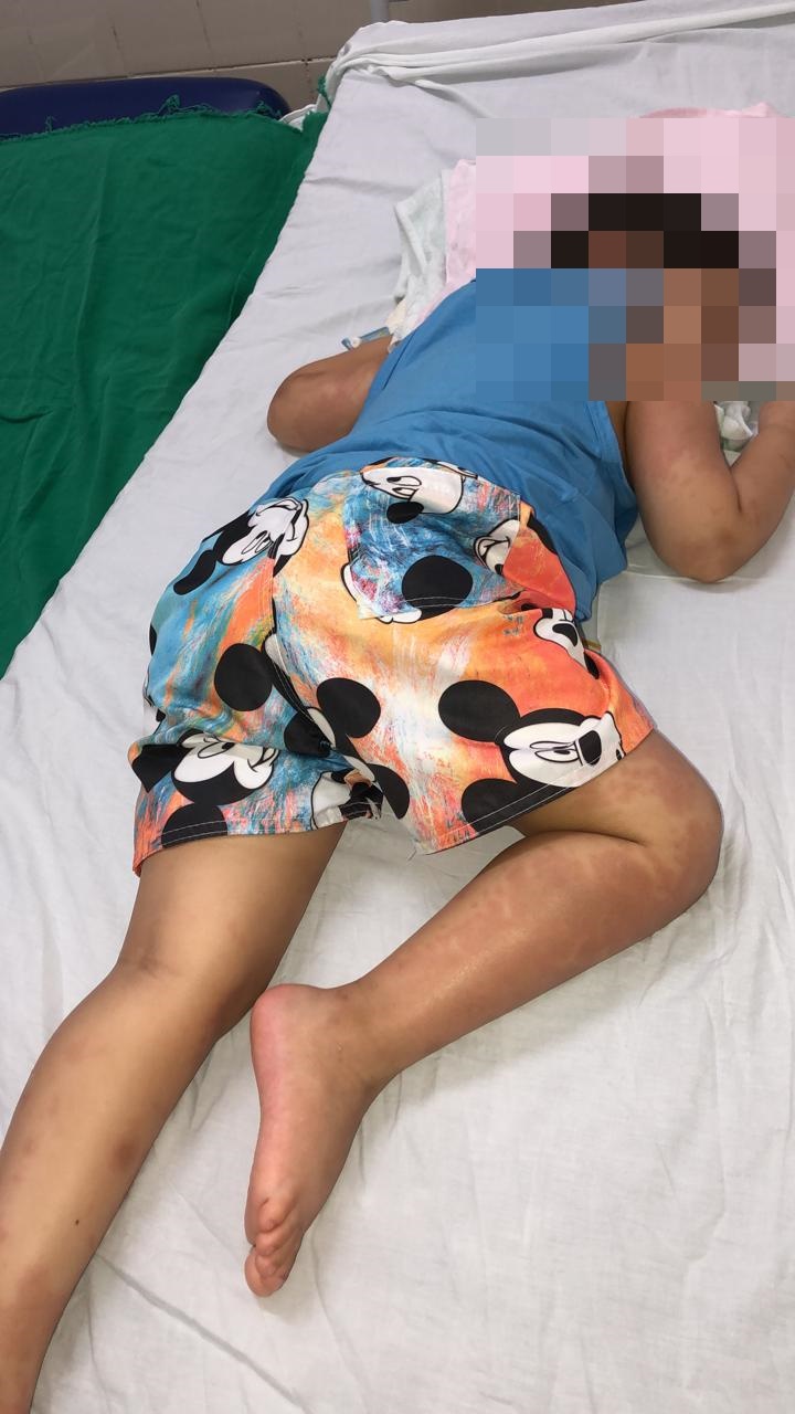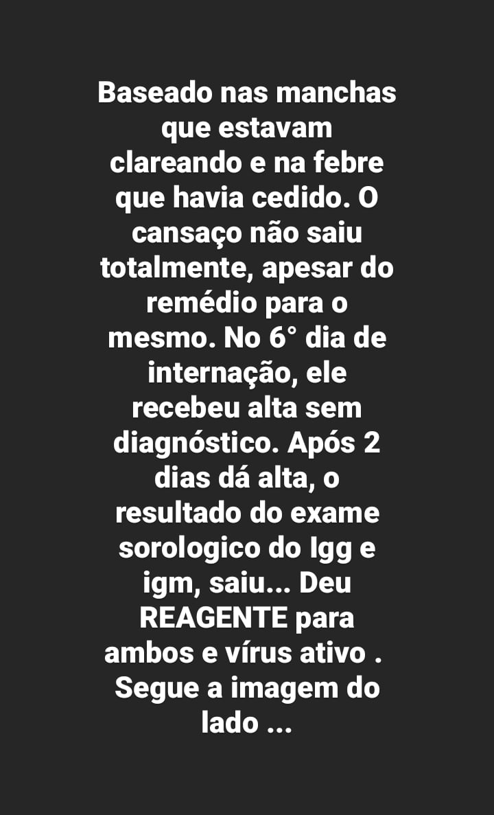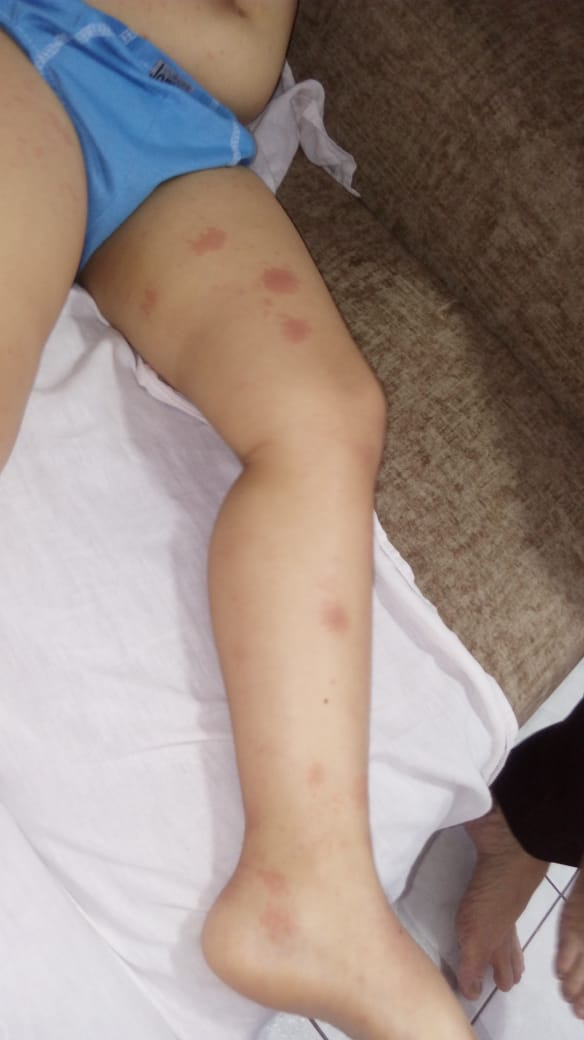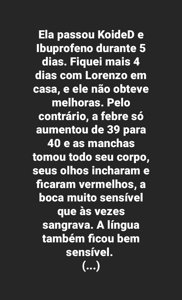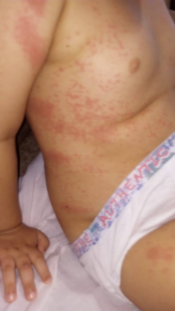 A mãe também enviou imagens do filho com os sintomas na pele ou edemas espalhados por todo o corpo, uma cópia do resultado do exame sorológico constatando ser covid e cópia do prontuário médico: