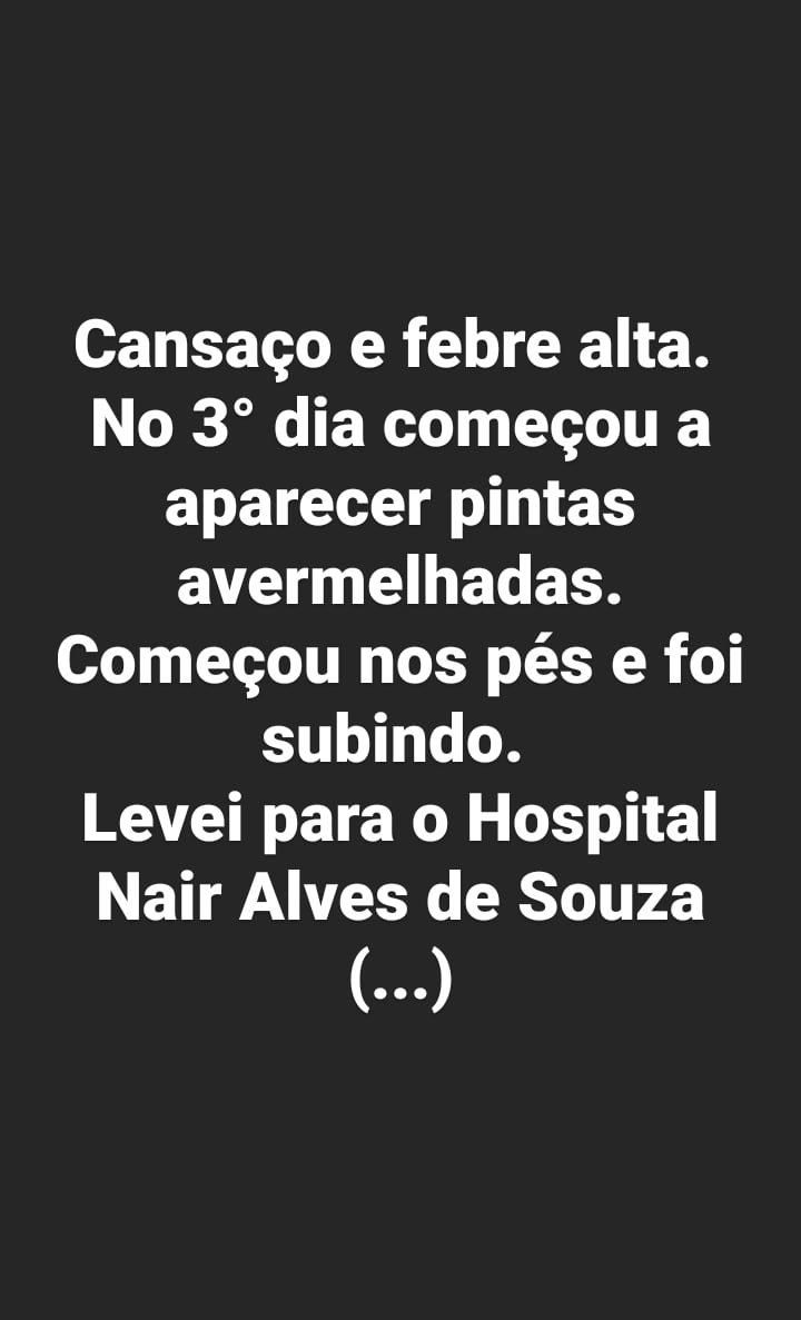 Pois eu fiquei com esses mesmo sintomas febre, muitas manchas vermelhas quando era anoite ficava sem ar meus olhos ficava vermelho meu rosto inxo parecia a cara de um boi ,passei uma semana nesse sufoco mais sobrevivi mim cuidando em casa .zulive ir pro hospital morre