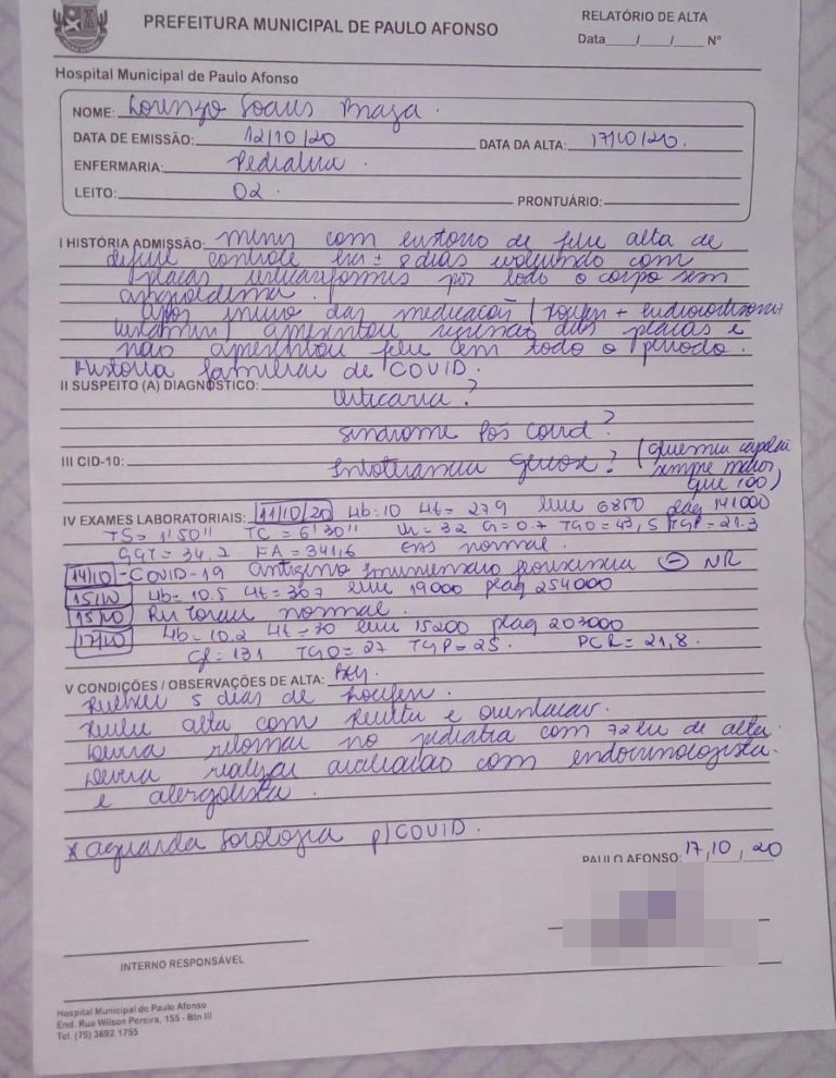 Após sintomas como febre alta de até 40º e edemas por todo corpo, a mãe e as equipes médicas tanto do Hospital Nair Alves de Souza (HNAS), quanto do Hospital Municipal de Paulo Afonso só descobriram que Lorenzo estava com o novo coronavírus dois dias depois da alta hospitalar.