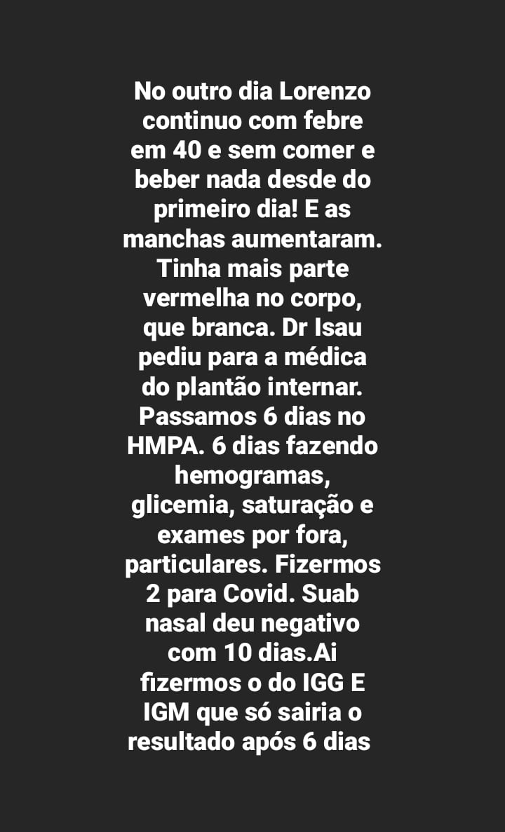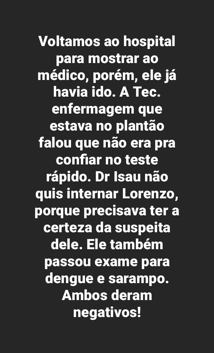 Josy disse que os sintomas são parecidos com outros tipos de doença, e advertiu: “Muita gente vem me pedindo para relatar sobre o Covid que Lorenzo teve, pelo fato dele precisar ficar internado e das reações que teve. Para poder alertar os pais sobre as crianças, pois as reações visíveis parecem com Rubéola ou Roséola…motivo pelo qual resolvi expor o que passamos para servir de alerta. Pois houve conclusão de diagnóstico sem exames, e se eu não tivesse corrido atrás de outra opinião, nem sei o que poderia ter acontecido.”, relatou. Ela agradeceu ao médico que foi responsável pelo alerta que poderia ser Covid em seu filho.