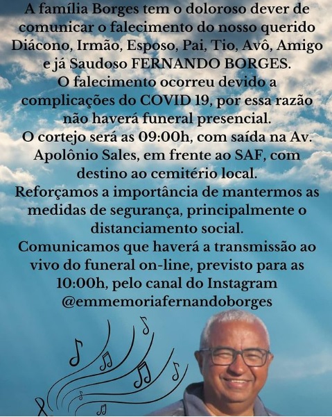 “Irmão Fernando”, como também era conhecido, por ser membro da Congregação Cristã, estava internado acerca de duas semanas num leito de UTI em Paulo Afonso. Com quadro grave da covid-19, ele teve que ser entubado, e infelizmente, faleceu neste sábado, 27 de março.