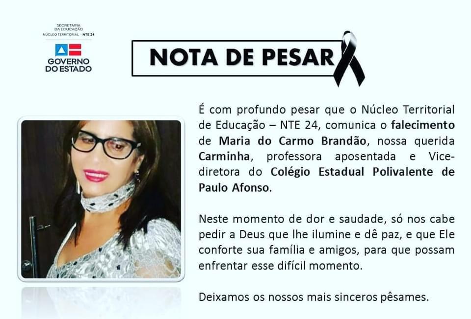 O Núcleo Territorial de Educação do Estado da Bahia divulgou em suas rede sociais Nota de Pesar e de solidariedade aos familiares da educadora. Veja abaixo: