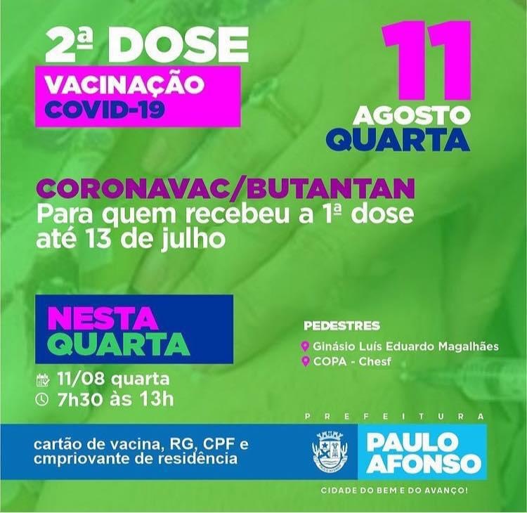 Com o recebimento de novas doses, Paulo Afonso amplia a imunização de primeira dose e segunda dose, nesta semana. A programação vacinal tem início nesta terça-feira (10), para a faixa etária a partir dos 29 anos, na quarta-feira (11) com segunda dose da Coronavac/Butantan e na sexta (13), com primeira dose para pessoas com 28 anos acima.