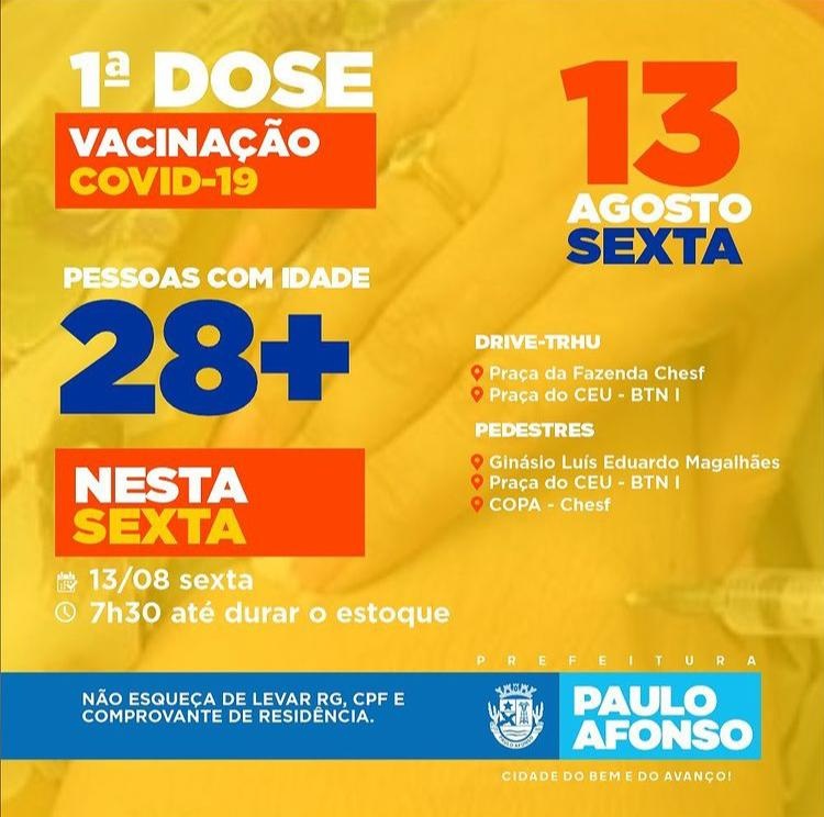 Já nesta sexta-feira (13), a programação é para ampliação do público de primeira dose para as pessoas com idade igual ou acima de 28 anos. Os locais de vacinação seguem as etapas anteriores. São eles – drive: Praça da Fazenda Chesf e Praça Céu, no BTN I e pedestre no Ginásio Luís Eduardo, Praça CEU e COPA.