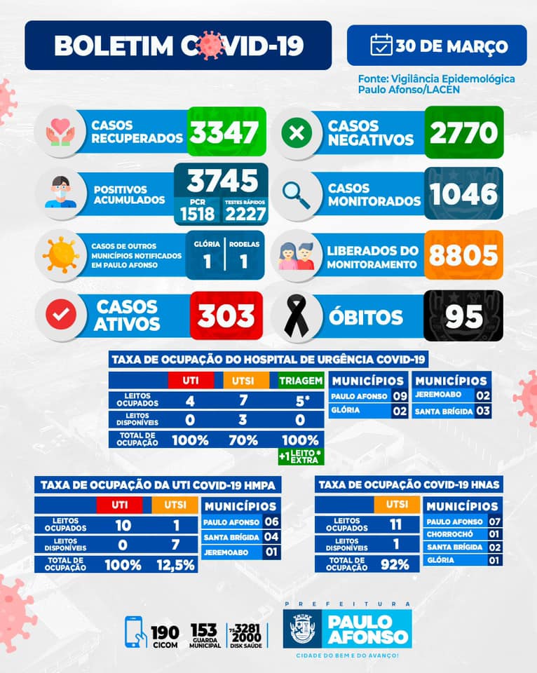 Paulo Afonso registra 6 óbitos em 48h, mais 41 infectados hoje e leitos de UTI seguem 100% ocupados