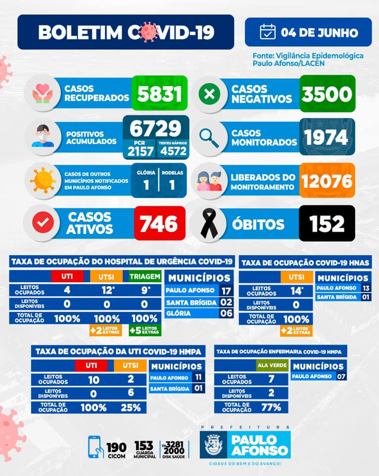 Paulo Afonso registrou mais 58 novos casos de covid-19 em 24h, de acordo com boletim epidemiológico divulgado pela Secretaria da Saúde do Município no final da tarde desta sexta-feira (4/6). Outros 38 pacientes foram considerados curados da doença. Com esses dados, o número de casos ativos aumento para 746, um dos mais altos até agora.