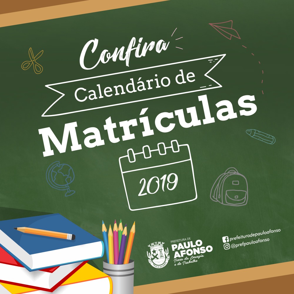 A Secretaria Municipal de Educação de Paulo Afonso informa o calendário de matrículas para o ano letivo de 2019. O período tem início no dia 12 de dezembro e segue até 18/01/2019.
