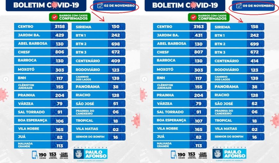 Nos últimos sete dias, o Bairro Siriema registrou 8 novos casos de covid-19, enquanto o Centro e o Centenário tiveram um aumento de 5 casos cada um no mesmo período. O Bairro Tancredo Neves (1, 2 e 3), que é o segundo com maior registro de contaminação desde o início da pandemia (o 1º é o centro), aumentou em apenas 1 caso, mesmo número que a Chesf, o terceiro bairro mais infectado.