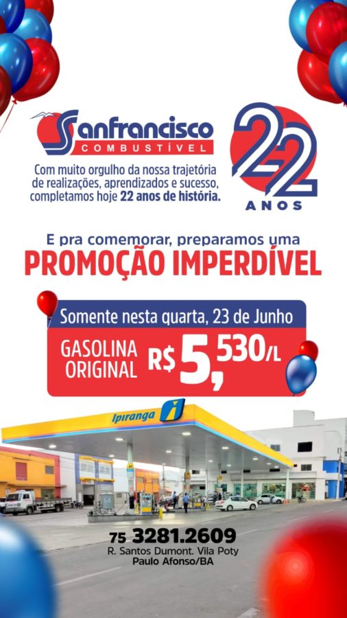 No aniversário de 22 anos do Posto San Francisco vai rolar uma super promoção! Nesta quarta-feira (23), somente nesta quarta, gasolina comum original por apenas R$ 5,53 o litro!