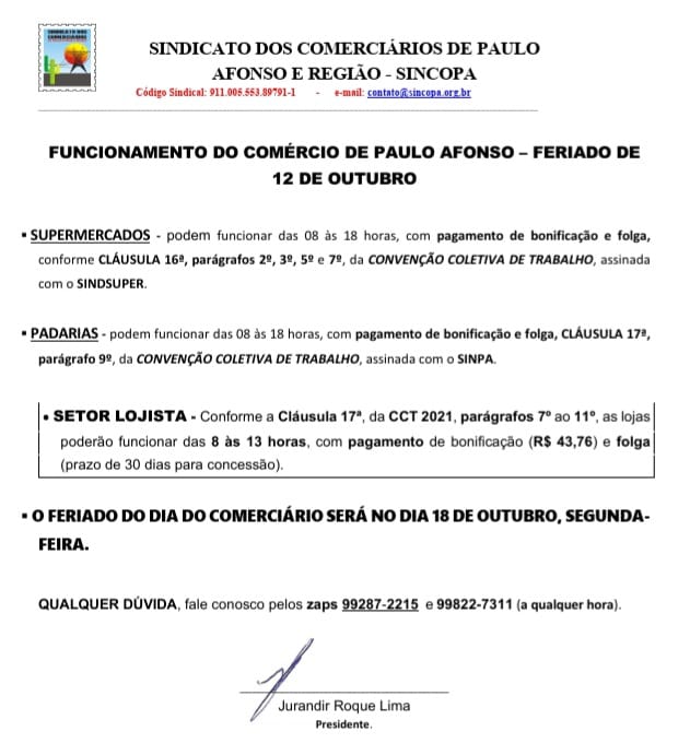 O comércio de Paulo Afonso poderá abrir na próxima terça-feira, 12 de outubro, feriado do Dia de Nossa Senhora Aparecida, quando também é celebrado o Dia das Crianças. A informação é do Sindicato dos Comerciários de Paulo Afonso e Região – SINCOPA.