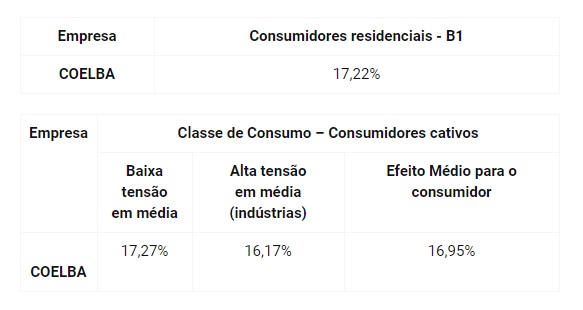 A Agência Nacional de Energia Elétrica (Aneel) aprovou, nesta terça-feira (17), um reajuste de 17,22% nas tarifas da Companhia de Eletricidade do Estado da Bahia (Coelba). Para consumidores conectados à alta tensão, o aumento será de 16,17%, e para a baixa tensão, a alta será de 17,27%. As novas tarifas já vigoram a partir do próximo domingo (22). A medida afetará diretamente milhares de cidadãos de Paulo Afonso e de toda Bahia.