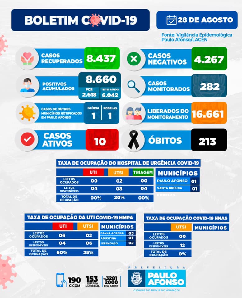 No total, desde o início da pandemia, o município registrou 8.660 casos confirmados, 8.437 recuperados e 213 óbitos pela doença. Veja quadro atualizado abaixo: