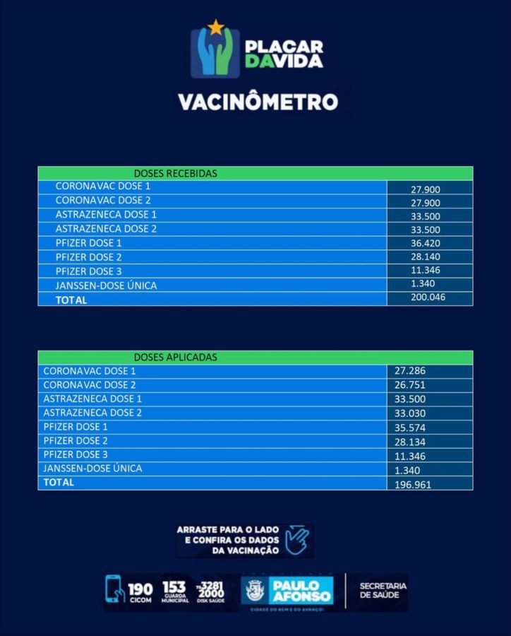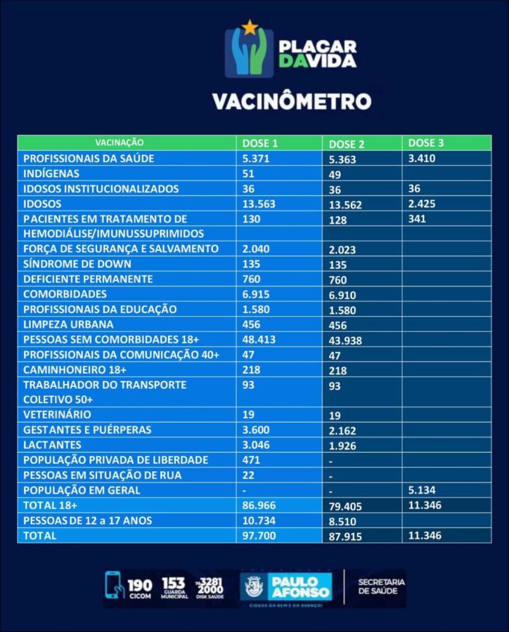 De acordo com a Secretaria de Saúde, o índice da 1ª dose da idade adulta ultrapassa os 100% porque atendeu a população da região e não somente do município, computando 86.966 pessoas, mas ainda há pauloafonsinos sendo vacinados.