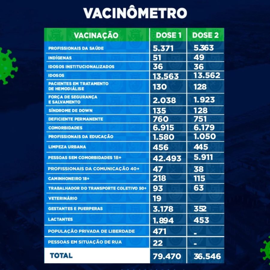 Os dados do vacinômetro apontam ainda 116.016 doses aplicadas, entre primeira e segunda, das vacinas Astrazeneca, Coronavac e Pfizer, e dose única, como a Janssen.