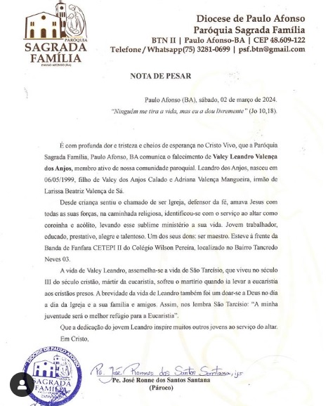 A Paróquia Sagrada Família do BTN, onde Leandro servia com dedicação como coordenador de coroinhas e acólitos, emitiu mais uma nota de pesar neste domingo (3). Nela, o pároco José Ronne destacou a vocação de Leandro para o serviço religioso desde a infância, comparando sua vida à de São Tarcísio, jovem mártir da Igreja primitiva e símbolo de fé e entrega. “A vida de Valcy Leandro assemelha-se a vida de São Tarcísio… A brevidade da vida de Leandro também foi um doar-se a Deus no dia a dia da Igreja e a sua família e amigos,” ressaltava a nota.