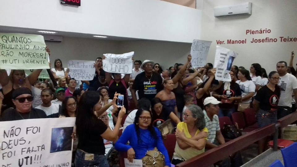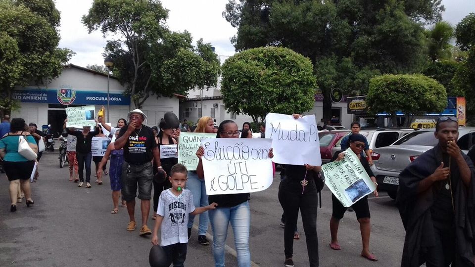 Com blusas pretas puxados por apitos e carro de som, os manifestantes seguiram em passeata do Parque de Exposições até a Câmara de Vereadores onde estava sendo realizada uma Sessão. Lá entraram e ergueram cartazes com frases que demonstravam a revolta do povo pela falta de UTI: “Quantos Paulinhos ainda irão morrer # UTI JÁ!”; “Paulinho não morreu, mataram”; “Não foi Deus, foi falta de UTI, Somos Todos Paulinho”; “Eleição sem UTI é golpe”.